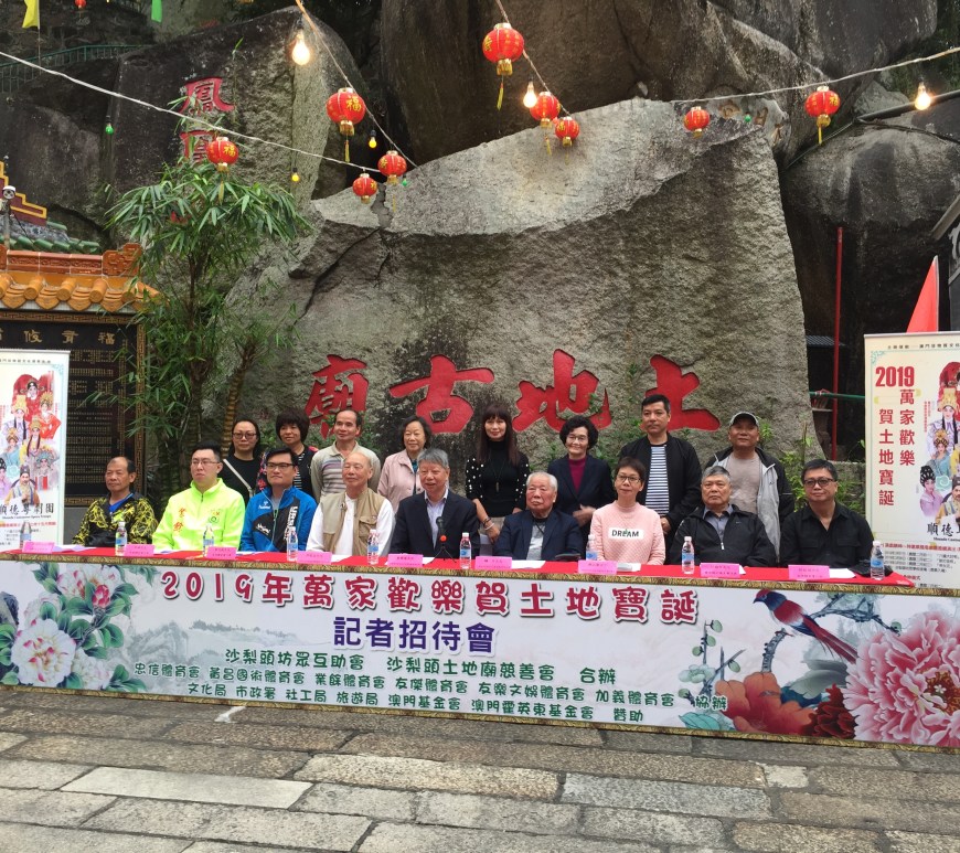 由沙梨頭坊眾互助會、沙梨頭土地廟慈善會舉辦,忠信體育會、黃昌國術體育會、業餘體育會、友傑體育會、友樂文娛體育會、加義體育會協辦,文化局、市政署、社工局、旅遊局、澳門基金會、澳門霍英東基金會贊助的「二零一九年萬家歡樂賀土地寶誕」活動,於三月七至九日在沙梨頭坊眾學校及沙梨頭土地廟舉行,今年賀誕神功戲邀請順德粵劇團來澳擔綱一連三晚的演出,歡迎坊眾到場欣賞,共賀佳節。負責人希望通過活動,弘揚傳統廟宇節慶文化,豐富旅遊資源,團結坊眾,豐富文娛康樂活動,促進社區和諧及發揚敬老愛老的優良傳統。