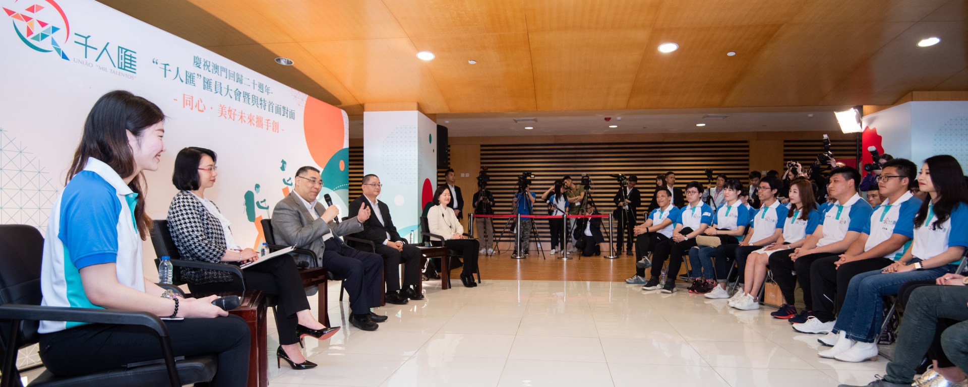 行政長官崔世安出席慶祝澳門回歸二十周年「千人匯」匯員大會暨與特首面對面活動前,與匯員進行三場分享活動,他勉勵青年人要做好自我提升,努力學習,把握國家和本澳發展機遇。
