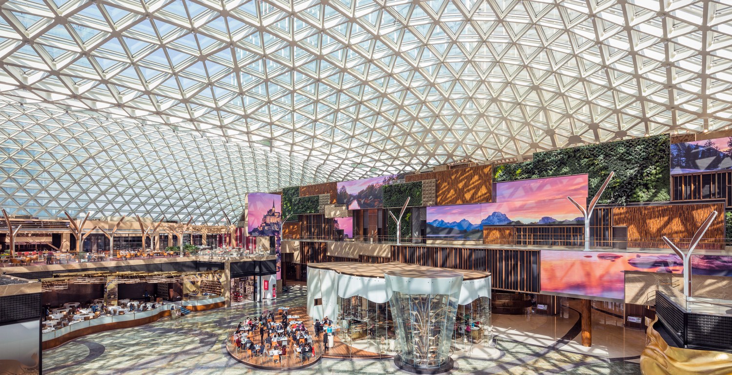 廣場內設置了25個面積大小不同的LED屏幕,360度全方位24小時展示一系列來自全球各地、獨一無二且匠心獨運的數碼藝術作品;植物牆環繞廣場四周,種植了超過10萬棵植物,為賓客締造了悠然舒適的休憩和用餐環境。廣場的環境氣氛更會因應天氣、日夜、季節甚至賓客的一舉一動而轉換,讓賓客仿如投入活靈活現、精彩紛呈的世界,以嶄新科技重新定義藝術、娛樂及餐飲體驗。