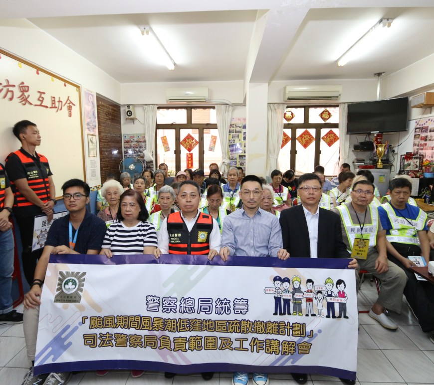 颱風季節將至,為進一步加強市民的防災避險意識,確保市民於颱風期間風暴潮來襲時,能夠按照當局指示迅速、安全有序撤離,在警察總局統籌下,司法警察局與社會工作局合作舉辦「颱風期間風暴潮低窪地區疏散撤離計劃」工作講解會及模擬演習,並公開接受市民報名參與,旨在加深市民對撤離工作流程的瞭解,加強司警局撤離小隊的疏散應變和協調能力,以及收集市民對撤離工作的意見,進一步優化相關工作流程。
