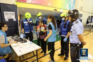 保安部隊及部門聯同民間社團和義工協助參與演習的市民到達避險中心