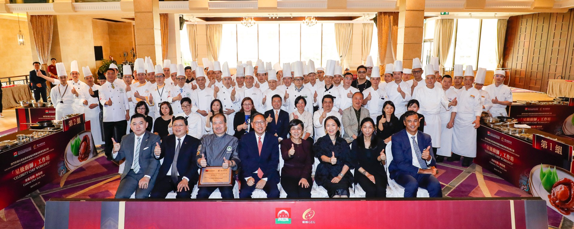 旅遊局局長文綺華及副局長程衛東、旅遊局培訓及質量管理廳廳長梁美彩、銀河娛樂集團董事程裕昇以及銀河娛樂集團人力資源及行政集團董事呂慧玲等出席在澳門銀河綠洲宴會廳舉行的「星級廚師」工作坊。