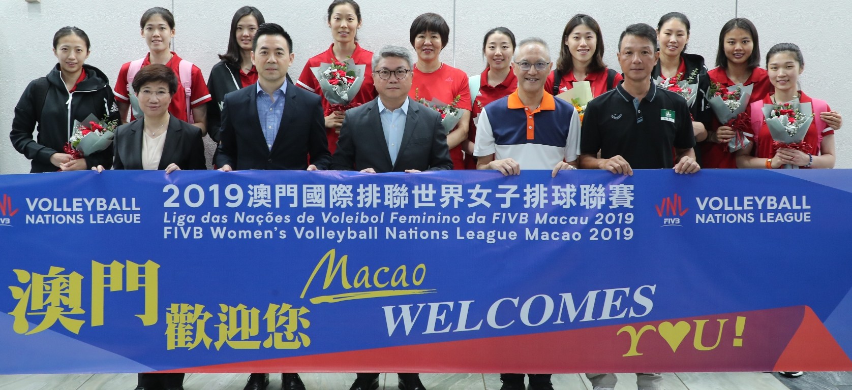 首周巴西站取得1勝2負的國家女排轉戰澳門站,由主教練郎平帶領多位球員今午抵達澳門國際機場,受到體育局局長潘永權及中國澳門排球總會理事長陳滿鋒等組委會員成員熱列歡迎。