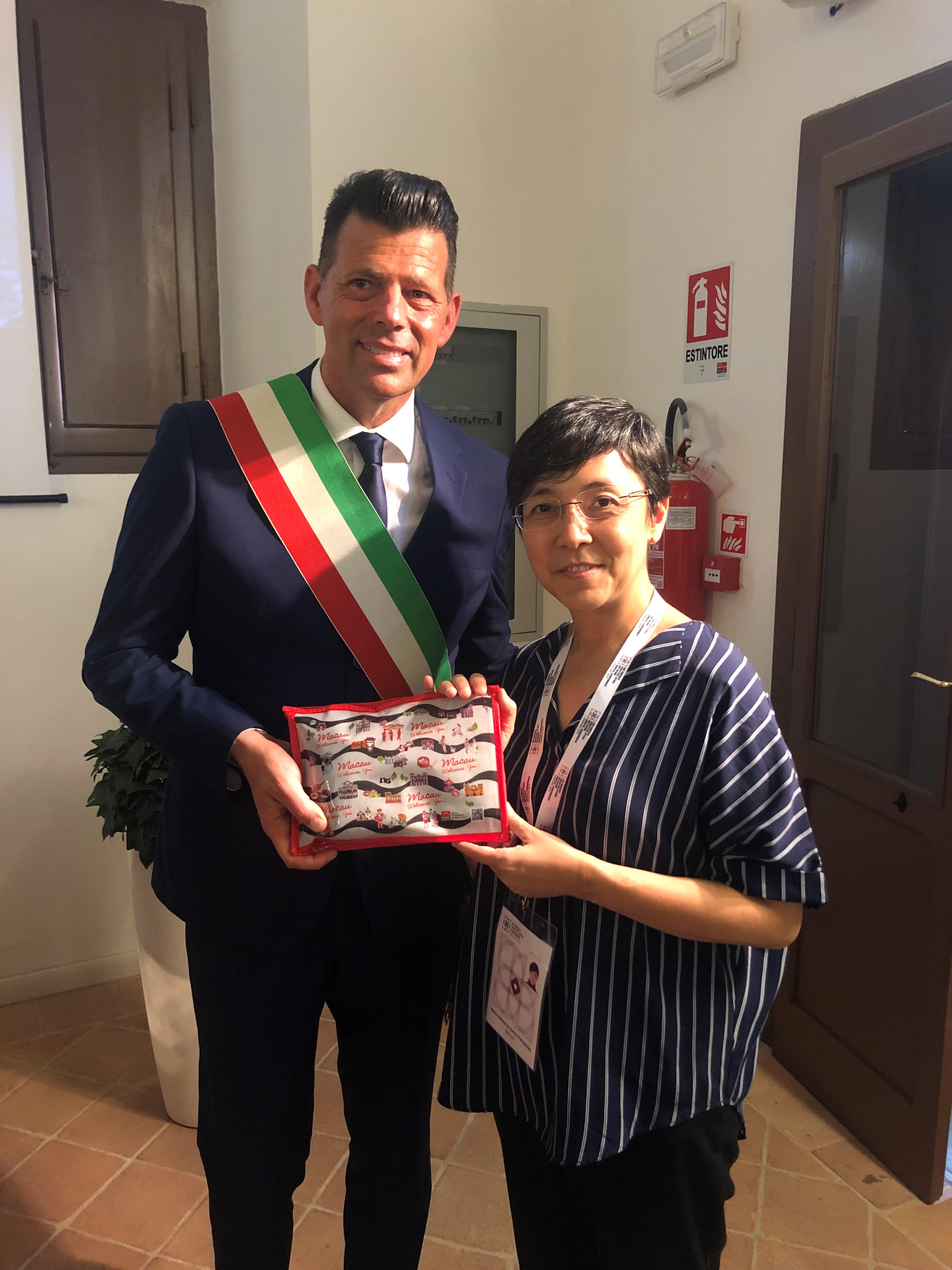 文綺華與塞尼加利亞市長Maurizio Mangialardi在當地的美食範疇小組會議前合照,該市亦計劃申報成為美食之都