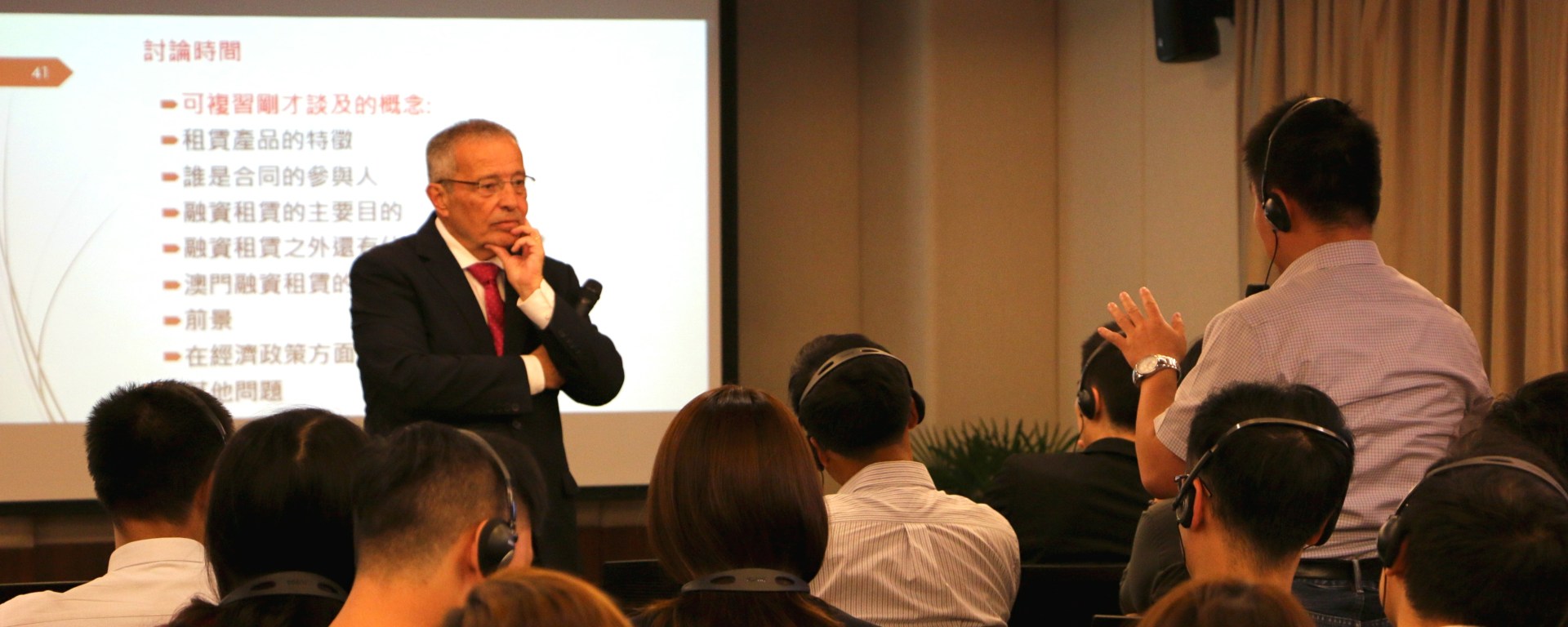 Dr. António Duarte應邀擔任今次講座的主講嘉賓,他現任職澳門大西洋銀行融資租賃總監,具40年豐富銀行商業信貸及培訓經驗,近年更於葡萄牙及安哥拉擔任相關範疇的顧問工作。他首先從法律和商業角度講解何謂「融資租賃」,以及探討其對公司的設備購置所產生的財務影響。他指出融資租賃歷史悠久,租賃交易更可追溯至公元前,澳門早在上世紀已建立了融資租賃的相關法律制度,由於當時經濟環境局限,融資租賃業務並不發達,時至今天澳門社會環境已發生了很大變化,特區政府更於本年完成修法工作,完善了對出租人和承租人的權益保障,並推出一系列稅務優惠政策,企業通過租賃可減輕固定資產的資金投入,為融資租賃業務創造發展空間。