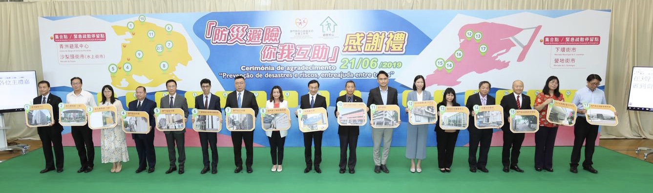社會文化司譚俊榮司長、社會工作局黃艷梅局長和韓衛副局長、澳門保安部隊高等學校許少勇校長、警察總局梅山明局長助理、教育暨青年局龔志明副局長、澳門理工學院李雁蓮副院長、衛生局葉炳基代副局長、市政署綜合服務及質量監察廳何菁華廳長、體育局體育設施管理廳何華廳長、澳門海星中學校黃彪校長、利瑪竇中學張慧玲校長、澳門培正中學郭敬文副校長、澳門慈幼中學區志權副校長、鏡平學校小學部劉少娟副校長、澳門少年飛鷹會原錦成總監和澳門工會聯合總會梁偉峰理事長,為「防災避險、你我互助」感謝禮主持啟動儀式。