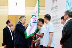 行政長官崔世安和中央政府駐澳門特區聯絡辦公室主任傅自應向五路學習參訪團的副團長授旗
