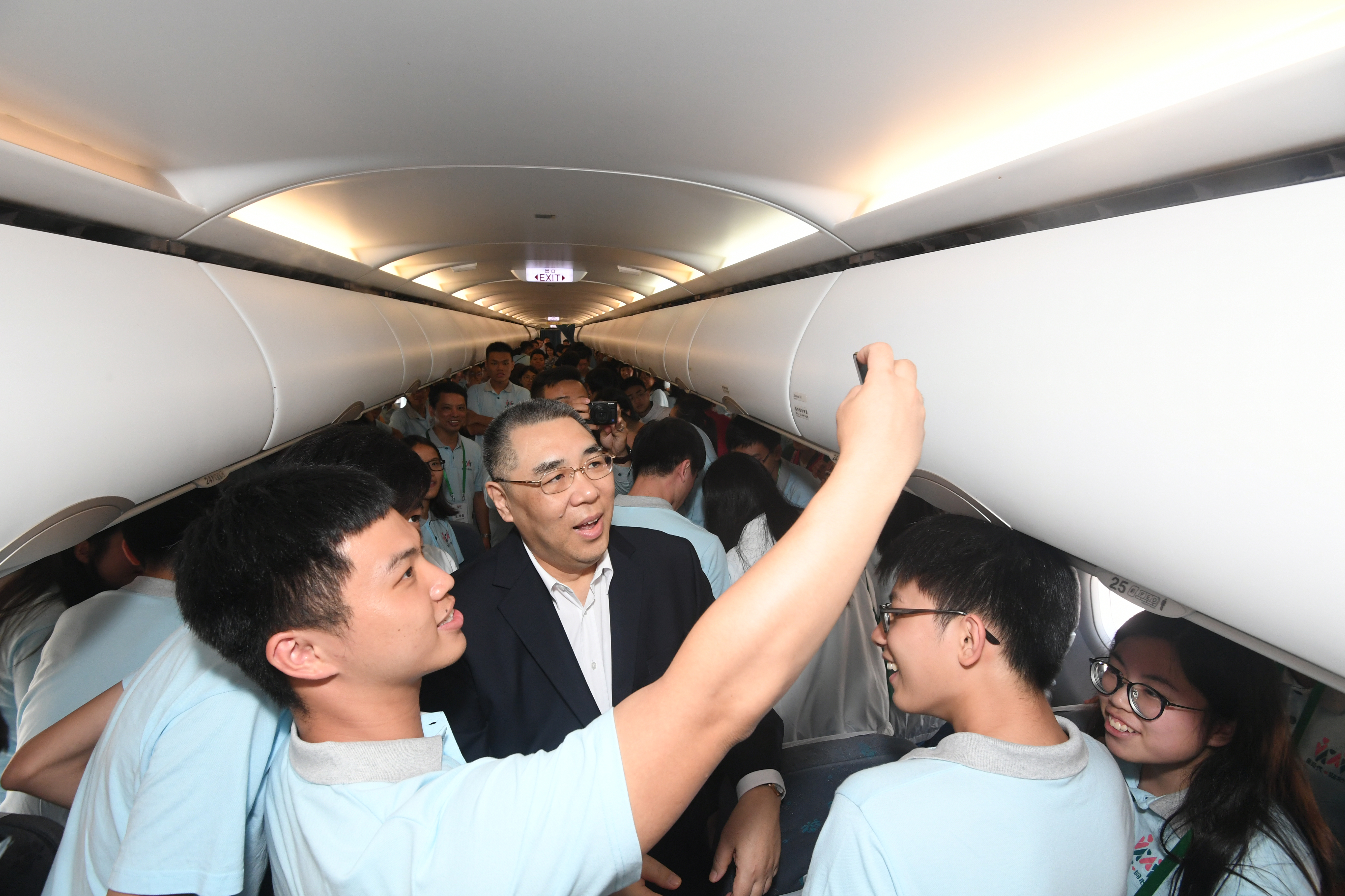 “新時代同心行”河北省學習參訪團行程圓滿結束,參訪團團員在回程飛機上與行政長官崔世安自拍和合照。