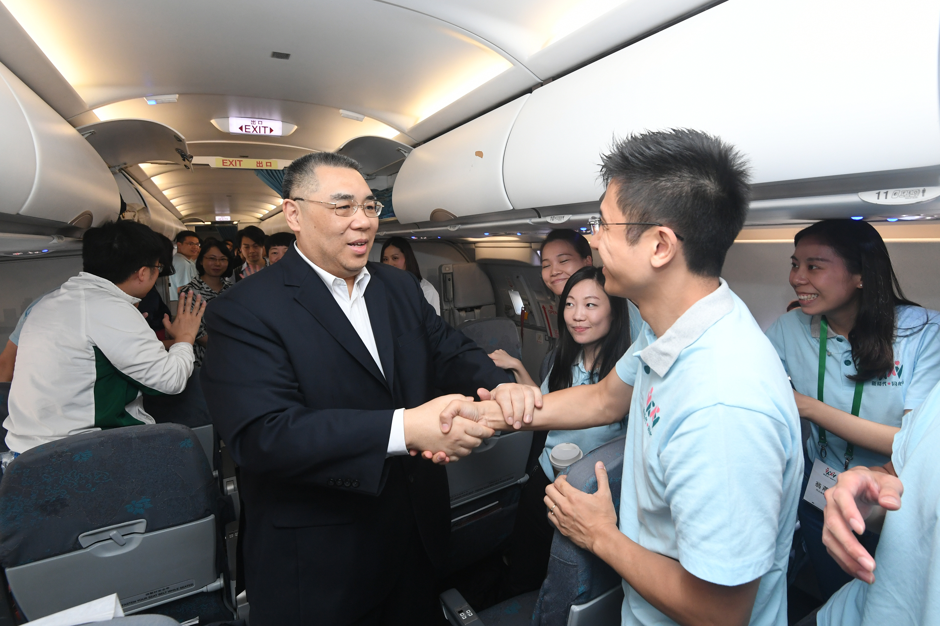 “新時代同心行”河北省學習參訪團行程圓滿結束,行政長官崔世安在回程飛機上與參訪團團員逐一握手,互相交流問好。
