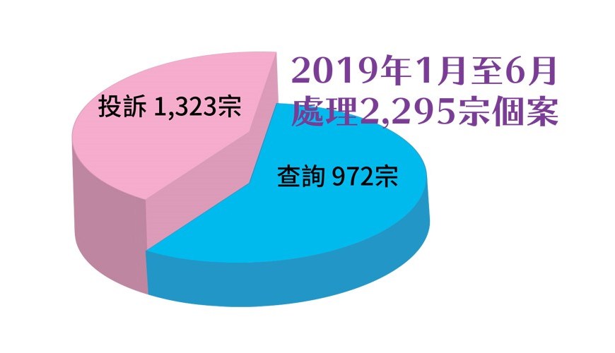 消費者委員會2019年上半年共接獲2,295宗查詢及投訴個案,總體個案數字比2018年同期下跌約百分之十五,其中1,323宗的投訴個案比上年同期增加約百分之四十。