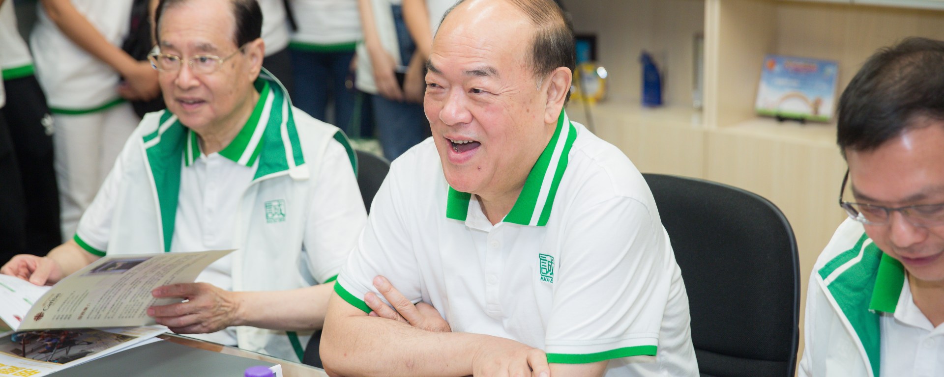 上午,賀一誠與競選團隊先到明愛崗頂老人中心,了解澳門社會服務開展情況及面對的挑戰。澳門明愛總幹事潘志明介紹明愛社服工作,希望來屆政府探討關愛互助住屋計劃的可能性,解決輕度弱智人士、長者等的居住需求, 並確保得到適切照顧。