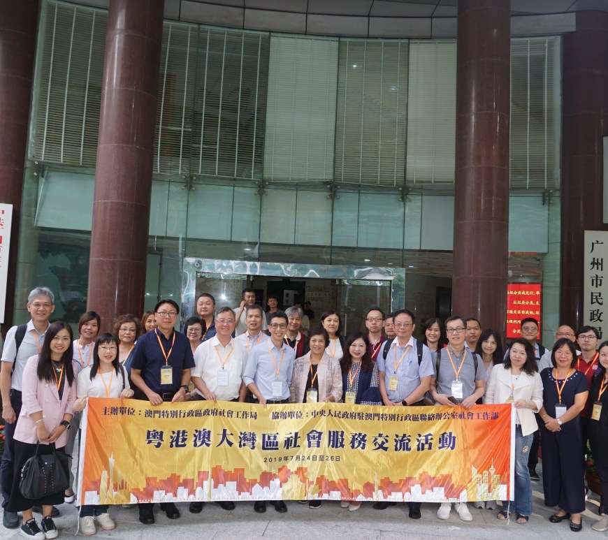 為了促進澳門社會服務界融入大灣區發展,由社會工作局主辦、中央人民政府駐澳門特別行政區聯絡辦公室社會工作部協辦的粵港澳大灣區社會服務交流活動,本澳業界代表已於本年7月24至26日期間,前往大灣區廣州市及佛山市進行考察交流。