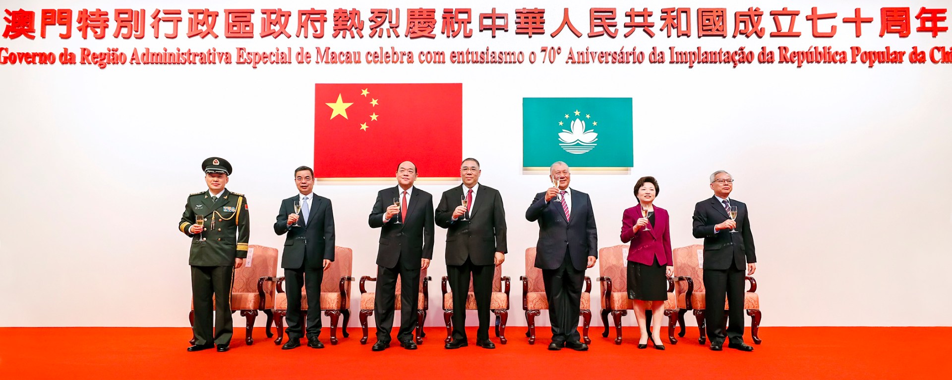 行政長官在致辭時表示,70年來,在中央堅強領導下,全國人民團結一心,為國家的繁榮富強不懈奮鬥,創造出令世界矚目的輝煌成就,人民的獲得感、幸福感、安全感不斷增強。當前,包括澳門同胞在內的全國各族人民,正緊密團結在以習近平主席爲核心的中央周圍,以創新、協調、綠色、開放、共享的新發展理念爲指引,齊心協力爲實現「兩個一百年」奮鬥目標、實現中華民族偉大復興的中國夢而努力奮鬥。