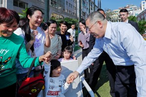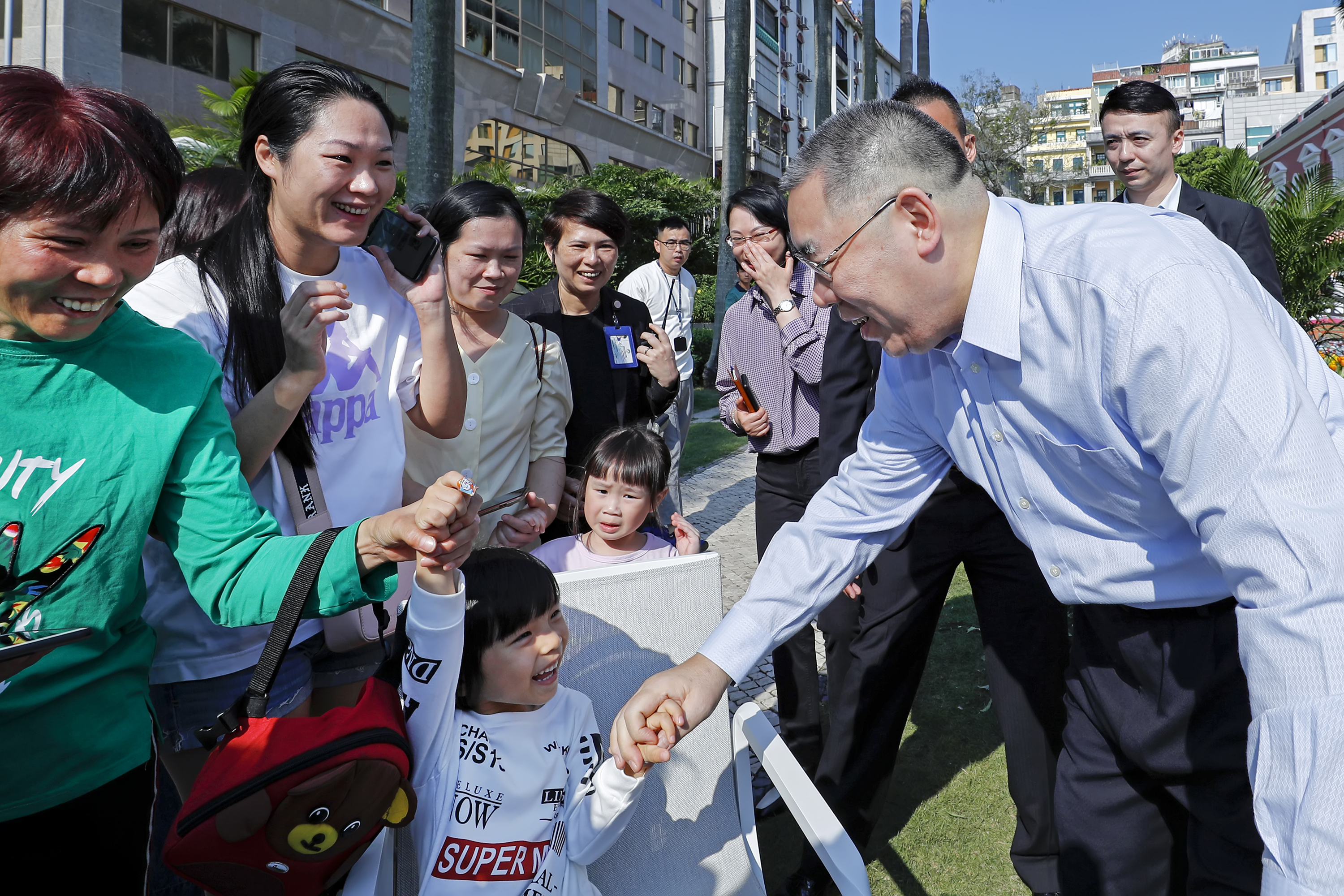 行政長官崔世安與參觀政府總部的民眾親切握手