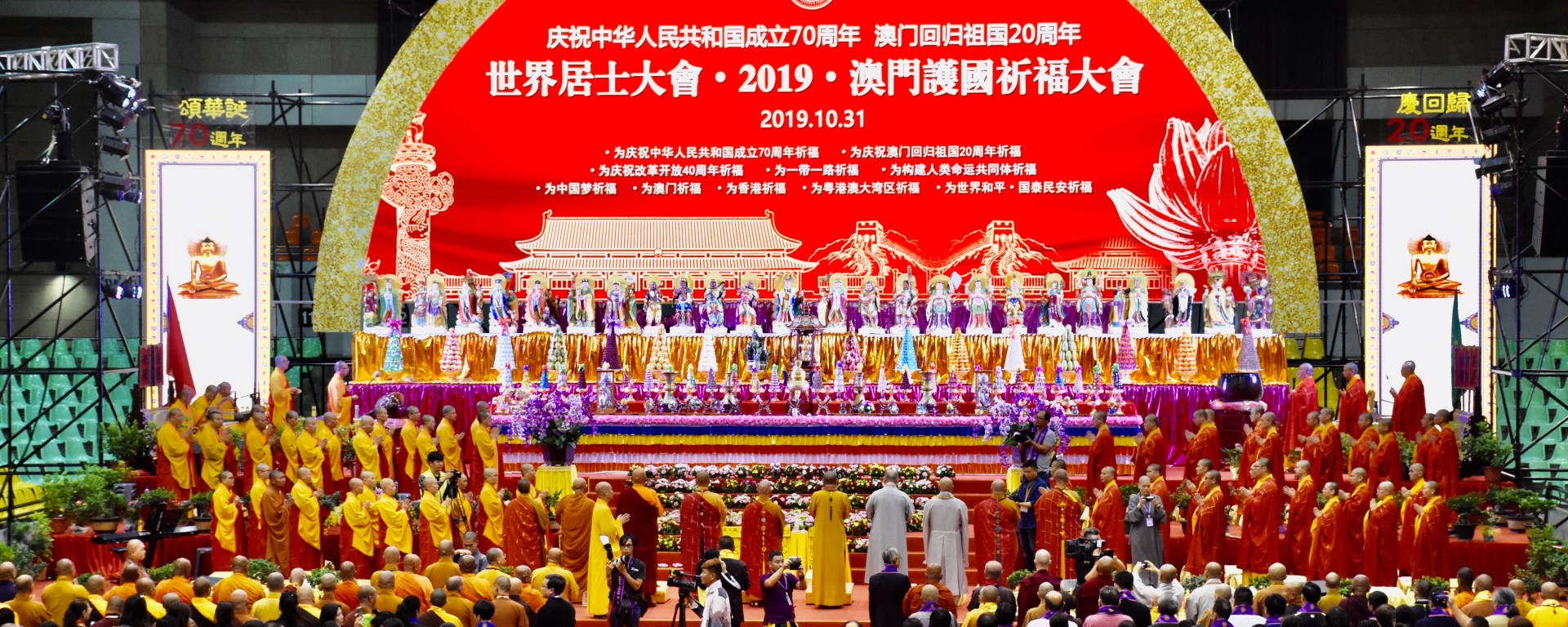 為慶祝建國70週年、澳門回歸祖國20週年,世界居士聯合會於在澳門綜藝館隆重舉行「世界居士大會——40國世界佛教界三大語系頌華誕慶回歸•2019澳門護國祈福大會」活動。來自世界40多個國家和地區的500多名高僧大德、全球居士代表、社會各界貴賓等萬人為國家的繁榮昌盛祈福,為「一帶一路」祈福,為「中國夢」祈福,為「人類命運共同體」祈福,為香港祈福,為澳門祈福,為國家和民族祈福,為世界和平,國泰民安祈福。