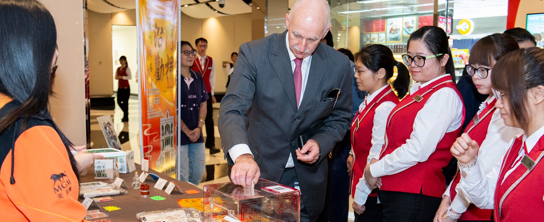 支票捐贈儀式上,美高梅中國控股有限公司首席執行官及執行董事簡博賢、總裁、首席策略官及董事馮小峰、美高梅人力資源高級副總裁余婉瑩與公共及社會事務副總裁王如茵將支票贈予同善堂,並由同善堂值理會主席崔世平、副主席鄭秀明、值理盧德華與蔡明威代表接收。同日,同善堂代表更親身到訪美獅美高梅參觀該堂服務推介攤位,以及參觀其它員工設施,以認識美高梅的日常運作。雙方並在支票交贈儀式後互相交流,分享各自對本澳慈善工作的意見。