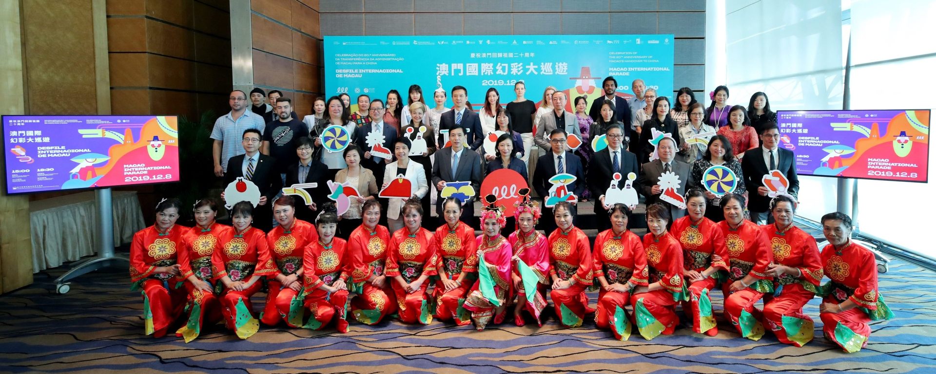 文化局局長穆欣欣、旅遊局代局長許耀明、消防局副局長鄒家昌、文化局副局長梁惠敏及陳繼春、市政署文康及公民教育廳廳長高佩珊、體育局體育設施管理廳廳長何華、教育暨青年局青年廳廳長張敏輝、文化局演藝發展廳廳長余慧敏、治安警察局行動及通訊處處長源劍鋒、文化局文娛活動處處長鄭繼明、澳門街坊會聯合總會副理事長李惠萍、澳門航空股份有限公司副總經理梁爽、澳門廣播電視股份有限公司節目及製作部總監陸鋼、新濠博亞娛樂有限公司首席政務關係總監馬寶明、銀河娛樂集團公共關係—企業及社區關係助理副總裁姚嘉茵、永利澳門及永利皇宮社區及政府關係行政總監李勁源、美高梅助理社會事務總監邵碧玲、澳門旅遊塔會展娛樂中心業務發展總監陳思雅、AJ Hackett Macau Tower銷售總監羅玉蓮及本地藝團代表等出席11月14日舉行的「2019澳門國際幻彩大巡遊」新聞發佈會。