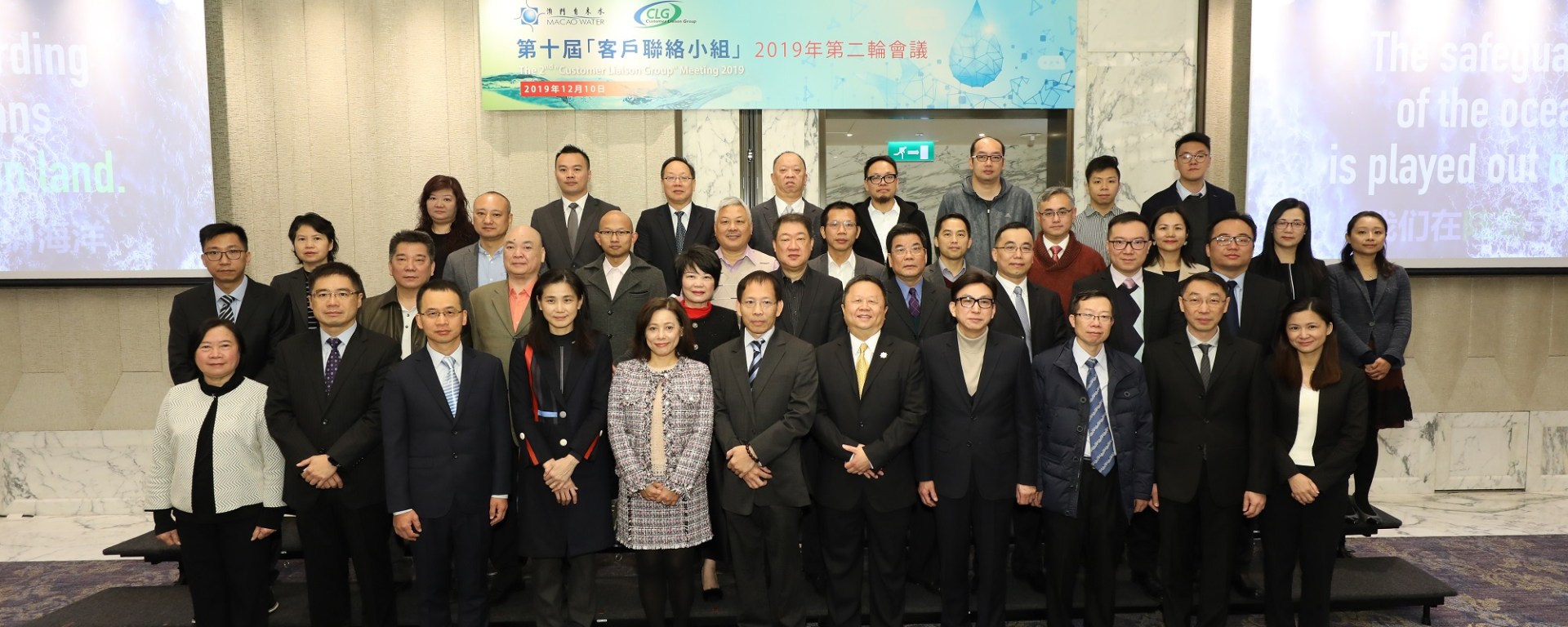 澳門自來水第十屆「客戶聯絡小組」2019年第二輪會議於12月10日上午舉行。海事及水務局局長黃穗文、澳門自來水執行董事關小冰、客戶聯絡小組主席朱偉文、副主席黃樹森、覃伯德,以及一眾小組成員出席。會議重點包括:澳門自來水微信公眾號升級後的功能介紹,內套管技術在本澳修復舊水管的應用,以及珠海供澳原水以及相關管網現況等。