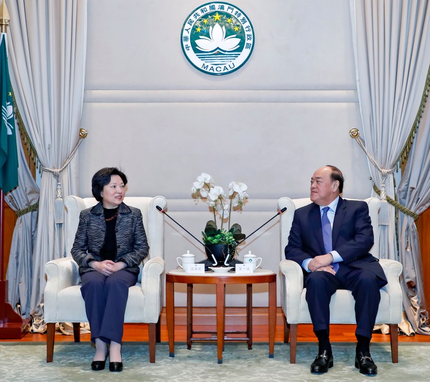 行政長官賀一誠日前在政府總部與外交部駐澳門特別行政區特派員公署特派員沈蓓莉會面,雙方就澳門特區的涉外事務進行交流及討論。