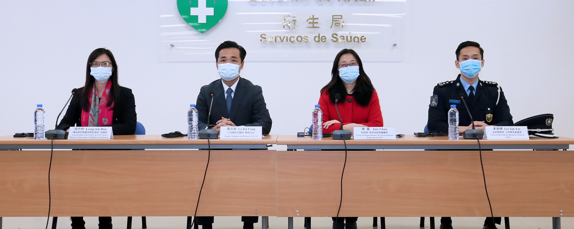 新型冠狀病毒感染應變協調中心於日前舉行「新型冠狀病毒最新情況及本澳各項防控措施」新聞發佈會,仁伯爵綜合醫院羅奕龍醫務主任、疾病預防控制中心傳染病協調員梁亦好醫生、旅遊局執照及監察廳陳露廳長、治安警察局公共關係處李德輝處長共同會見傳媒。