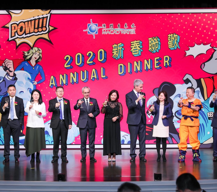 澳門自來水日前假永利皇宮宴會廳舉行「二零二零年新春聯歡晚宴」,藉此感謝員工、合作夥伴和各界友好一直以來的鼎力支持。晚宴筵開逾四十席,多位來自本澳政、商、學術界知名人士、公用事業機構、社會團體的嘉賓、以及現職和退休員工等近五百人出席。