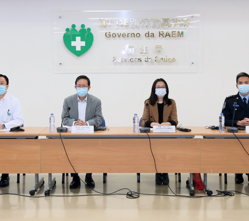 新型冠狀病毒感染應變協調中心於2月9日舉行「新型冠狀病毒最新情況及本澳各項防控措施」記者發佈會,衛生局疾病預防控制中心林松主任、旅遊局執照及監察廳陳露廳長、治安警察局行動及通訊處馬超雄處長以及仁伯爵綜合醫院急診部協調員曾潭飛醫生共同會見傳媒。