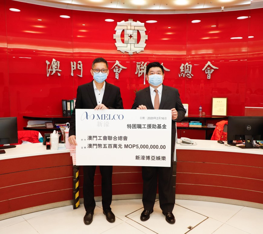 繼早前率先向湖北省和武漢市捐出2,000萬港元以助遏止新型冠狀病毒蔓延後,新濠再宣佈捐出澳門元500萬元與澳門工會聯合總會設立「特困職工援助基金」,攜手幫助受新型冠狀病毒疫情影響的職工界人士。援助基金的目標受惠者包括的士及旅遊巴司機、導遊和自僱人士等,以及他們的家人。新濠將與澳門工會聯合總會緊密合作及發放捐款予有需要人士。
