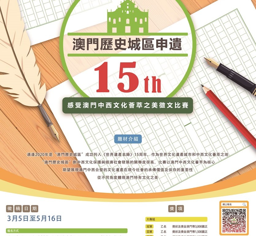 由澳門文遺研創協會主辦,高等教育局贊助的澳門歷史城區申遺十五週年「感受澳門中西文化薈萃之美」徵文比赛即日起接受投稿,截止日期為2020年5月16日。協會多年來為文化遺產展開研究和創作,承傳和推廣澳門歷史文化,發展文化遺產事業。適逢2020年是「澳門歷史城區」成功列入《世界遺產名錄》15周年。澳門作為世界文化遺產城市和中西文化薈萃之地,希望藉此比賽使青年人及大眾市民更能了解澳門中西文化交融的背景及意義。