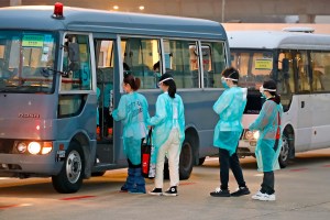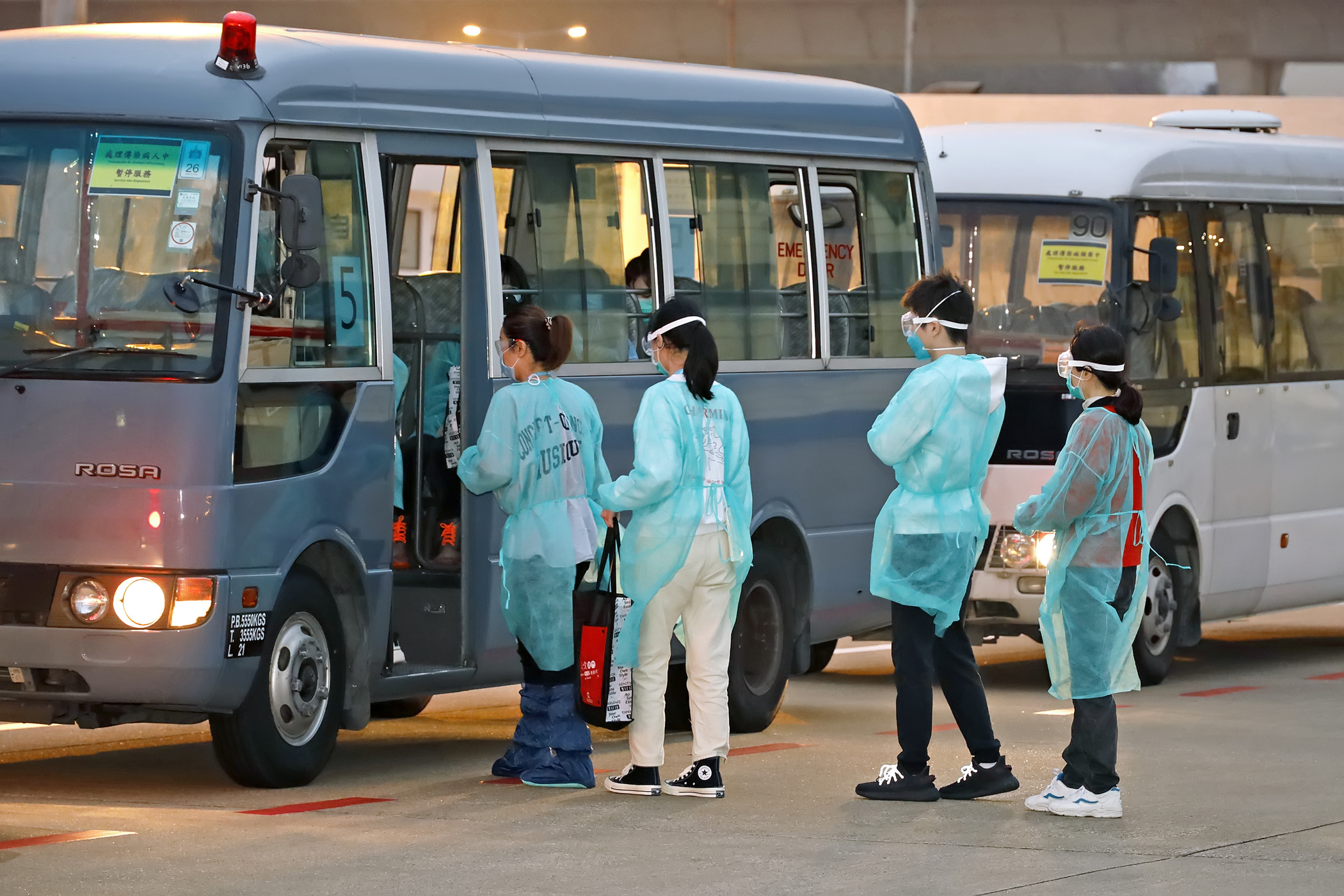 由湖北回澳的澳門居民離開機艙,隨即登上消防局安排的車輛,前往路環高頂公共衛生臨床中心。 (2)