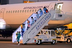 由湖北回澳的澳門居民離開機艙,隨即登上消防局安排的車輛,前往路環高頂公共衛生臨床中心。