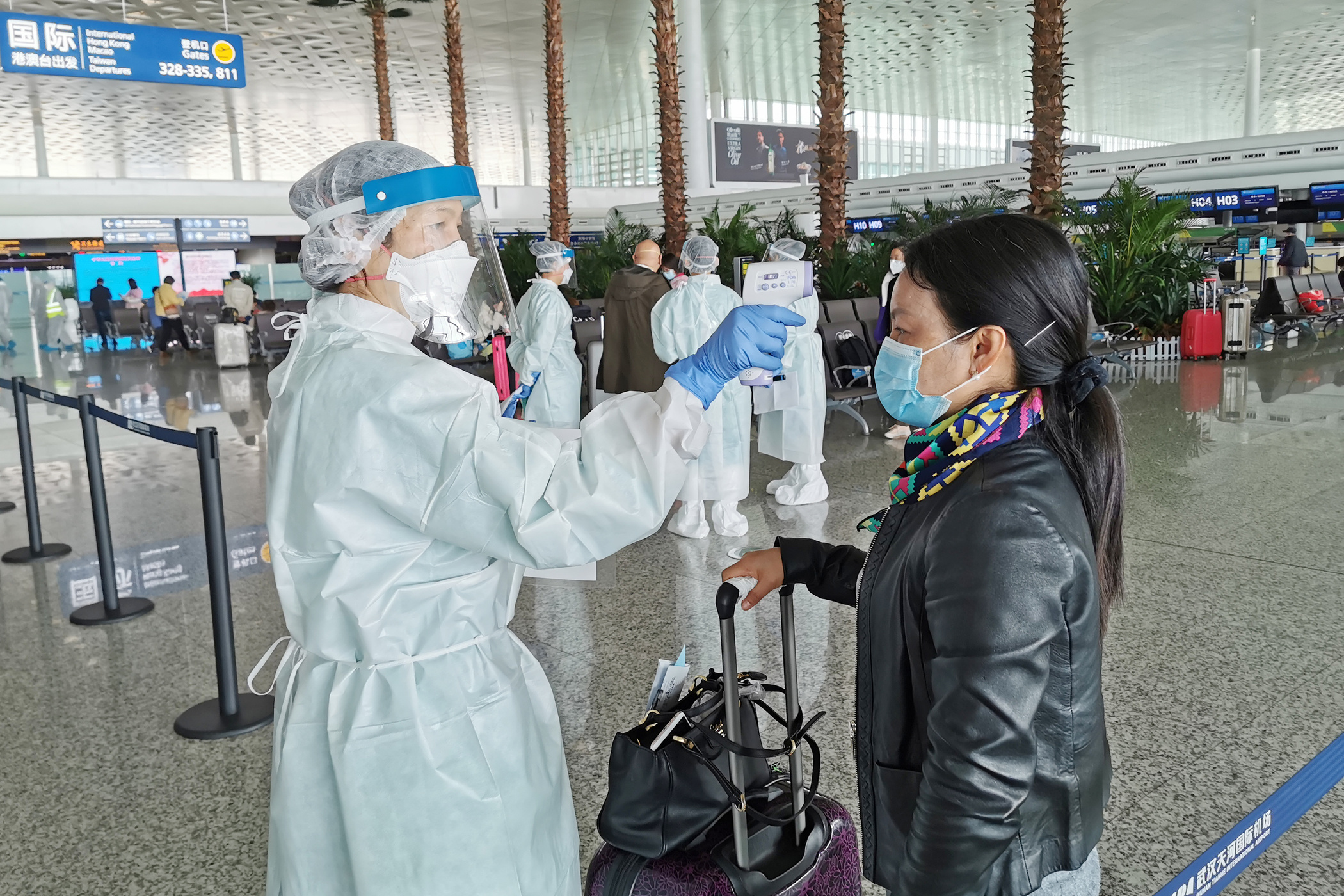 醫護人員為澳門居民進行健康檢查,測量體溫。