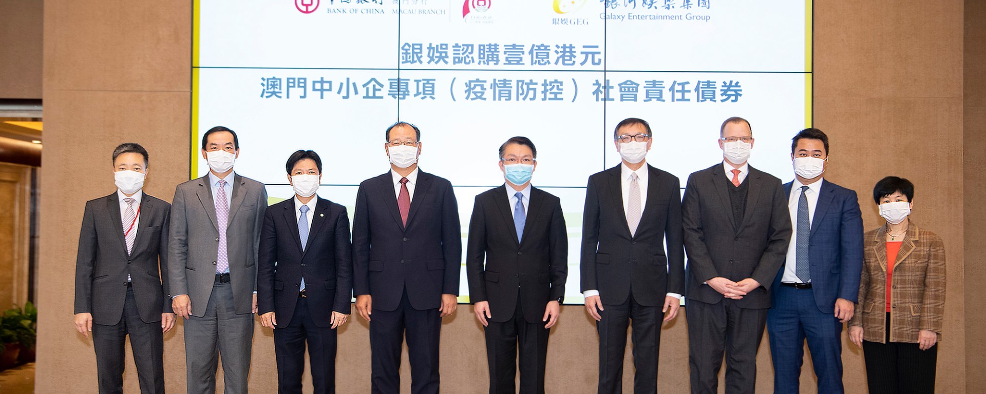 銀河娛樂自展開新型冠狀病毒疫情防疫工作以來,一直與社會各界凝心聚力,並肩抗疫。為向受疫情影響之本地中小企業提供適切的援助,在澳門特別行政區政府經濟財政司司長李偉農先生的見証下,銀娛宣佈投放一億港元,認購中國銀行澳門分行日前發行之「中小企業專項(疫情防控)社會責任債劵」,以協助緩解本地企業在疫情下所受到的影響。