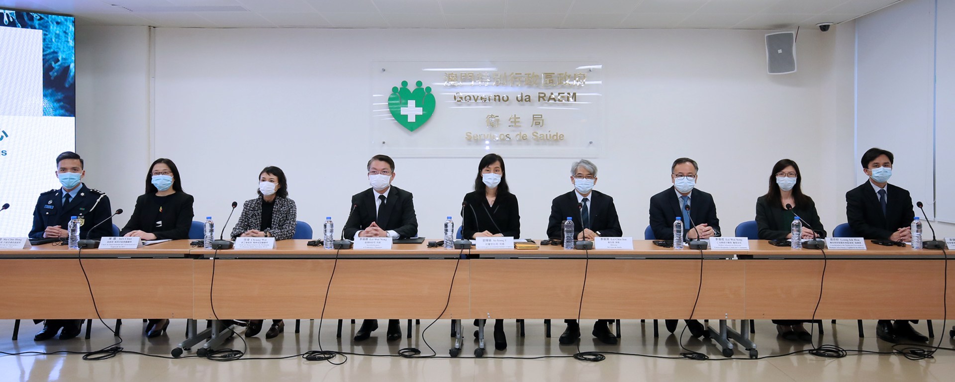 新型冠狀病毒感染應變協調中心日前舉行例行記者會,社會文化司歐陽瑜司長、經濟財政司李偉農司長、衛生局李展潤局長、勞工事務局職業培訓廳張瑋廳長、仁伯爵綜合醫院醫務主任李偉成醫生、旅遊局執照及監察廳陳露廳長、教育暨青年局教育研究暨資源廳黃健武廳長、治安警察局行動及通訊處馬超雄處長、疾病預防控制中心傳染病協調員梁亦好醫生共同會見傳媒。