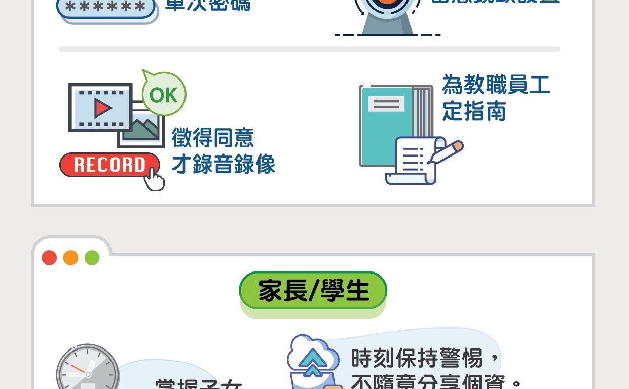 - 由於使用視像鏡頭過程中有可能會拍攝到學生或其家人的私人生活狀況,因此教師不應強迫學生或家長開啟視像鏡頭,並應指引學生注意放置鏡頭拍攝之範圍;