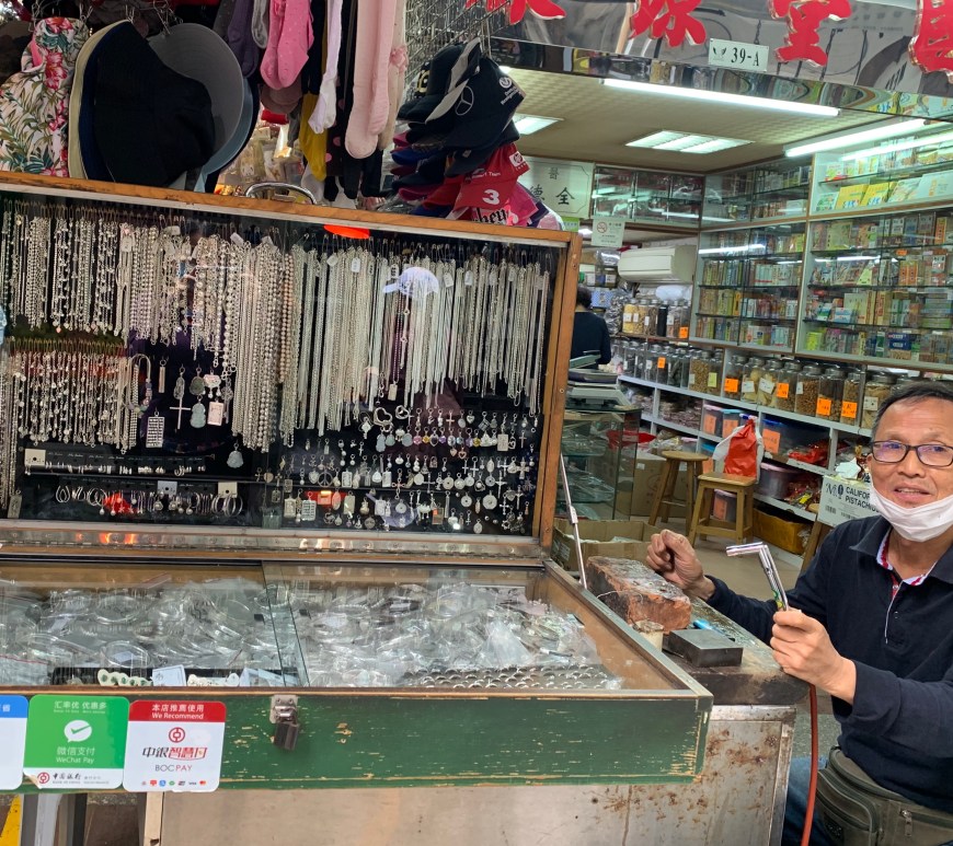 在義字街近渡船街一段,有一賣銀器的攤檔,販主黃師傅經常被捧場客圍住,大受歡迎。攤檔在一九八二年正式登記,獲批准經營,轉眼已卅八年。黃師傅真是猛龍過江,初時在油麻地起步,也做過銀器營業員。他熟悉銀飾的買賣及工藝,喜歡義字街的環境,與顧客結成好友。他曾在美副將大馬路開過店,但生意不及街檔。許多外傭,包括來自菲律賓、印尼、越南的,都喜歡光顧,覺得他誠懇老實。黃師傅的銀飾平至數十元,人人都買得起,而且成色高,達到九九,而並非僅為九二五。他的銀飾款式多造型精美,有傳統有新潮,這類攤檔有存在的價值。