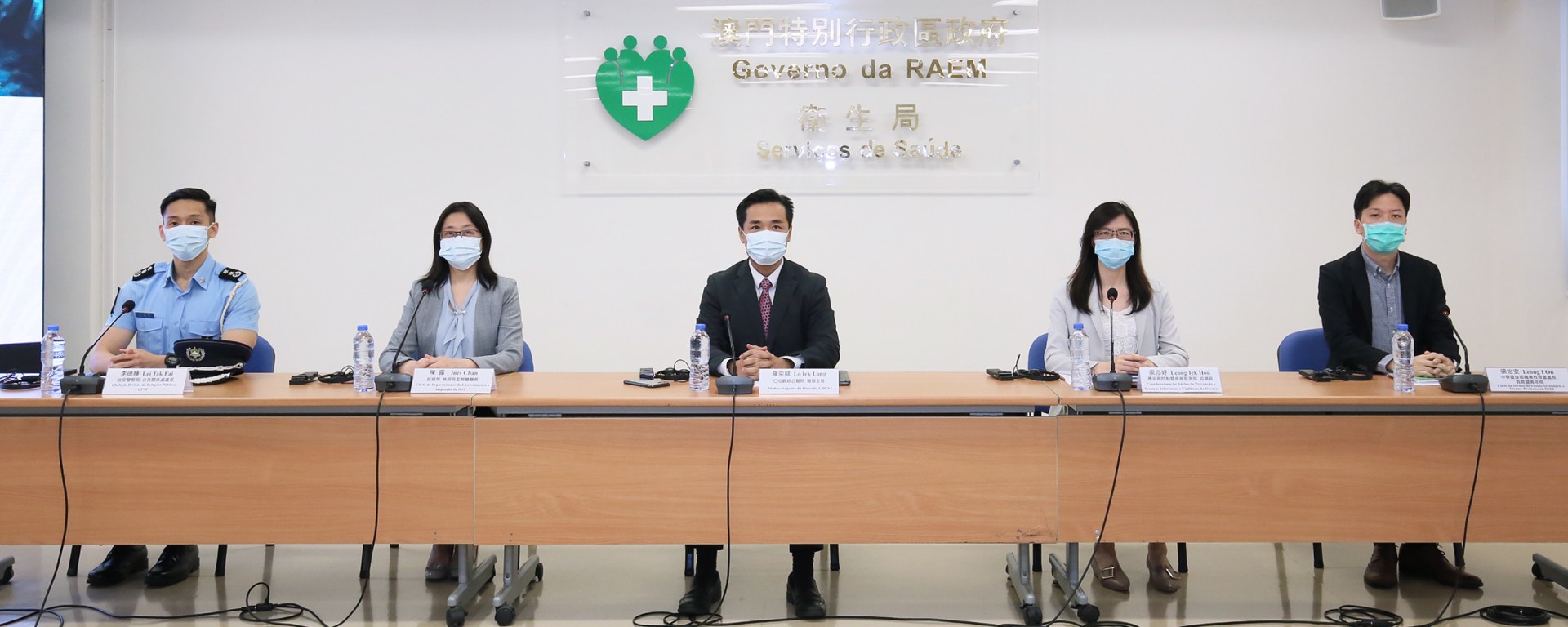 新型冠狀病毒感染應變協調中心18日舉行例行記者會,仁伯爵綜合醫院羅奕龍醫務主任、旅遊局執照及監察廳陳露廳長、教育暨青年局中學暨技術職業教育處梁怡安處長、治安警察局公共關係處李德輝處長、疾病預防控制中心傳染病防制暨疾病監測部梁亦好協調員共同會見傳媒。