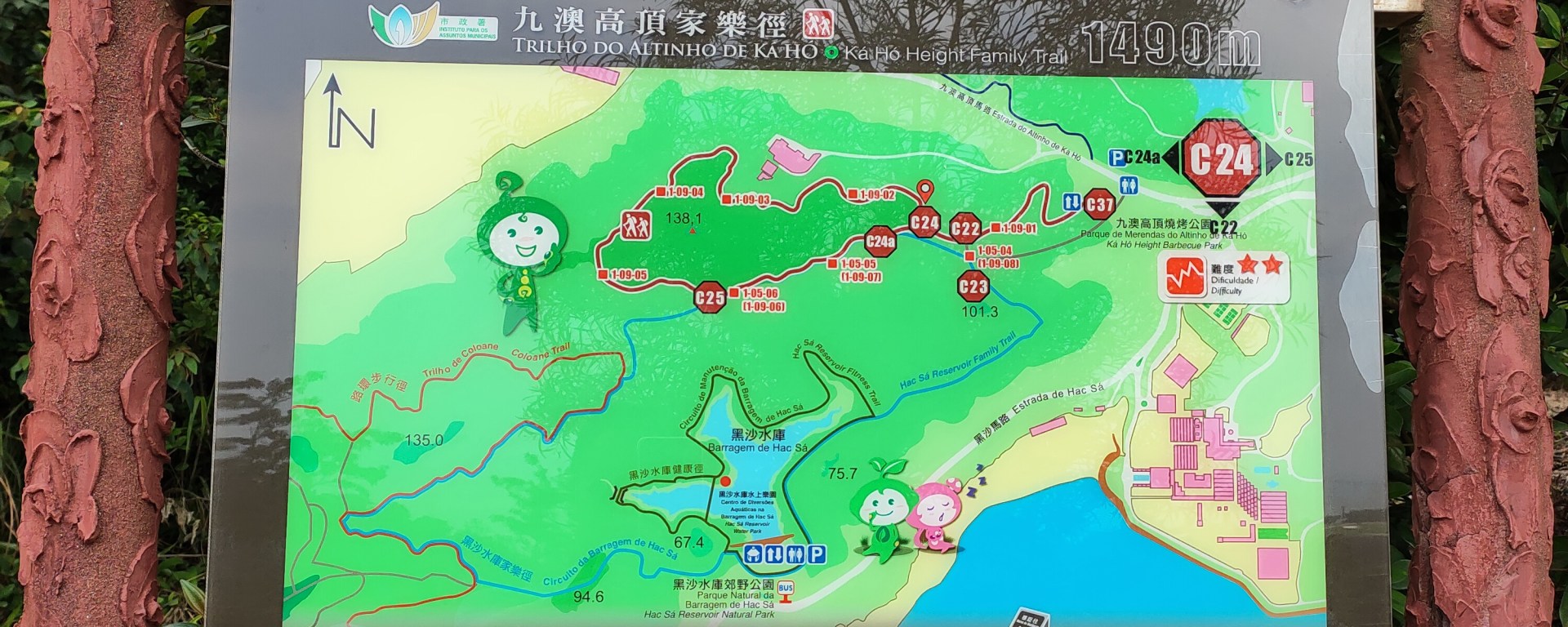 沿家樂徑拾級而上,可以欣賞九澳水庫的風景,還可以遠眺澳門高爾夫球場,路環濾水廠的設施也可一覽無遺。離遠還可以見到矗立在疊石塘山頂的媽祖像。