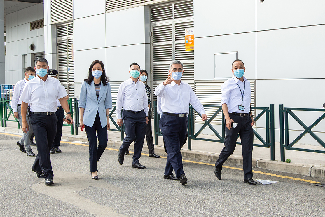 兩司長及一行官員首先視察了關閘廣場離境人流的管理措施,並瞭解通關人士轉換健康碼及離境大堂檢查健康碼的分流情况,以及就市民和外地僱員轉碼後的通關便利,提出了優化建議。