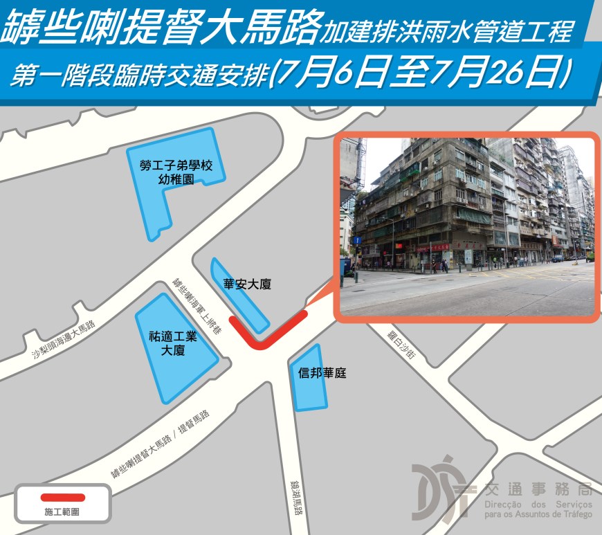 為改善新橋區於暴雨期間的水浸情況,市政署於七月六日開展「罅些喇提督大馬路加建排洪雨水管道工程」,連接到位於罅些喇海軍上將巷的現有雨水渠,以加強該區雨水管網的排水能力。工程分階段進行,期間將有臨時交通措施,敬請市民留意。「罅些喇提督大馬路加建排洪雨水管道工程」將建造長度一百八十米、直徑一點二米的雨水排水渠,連接罅些喇海軍上將巷的現有雨水渠,加大排洪能力,避免區內因暴雨而出現的水浸情況。工程分四階段進行。