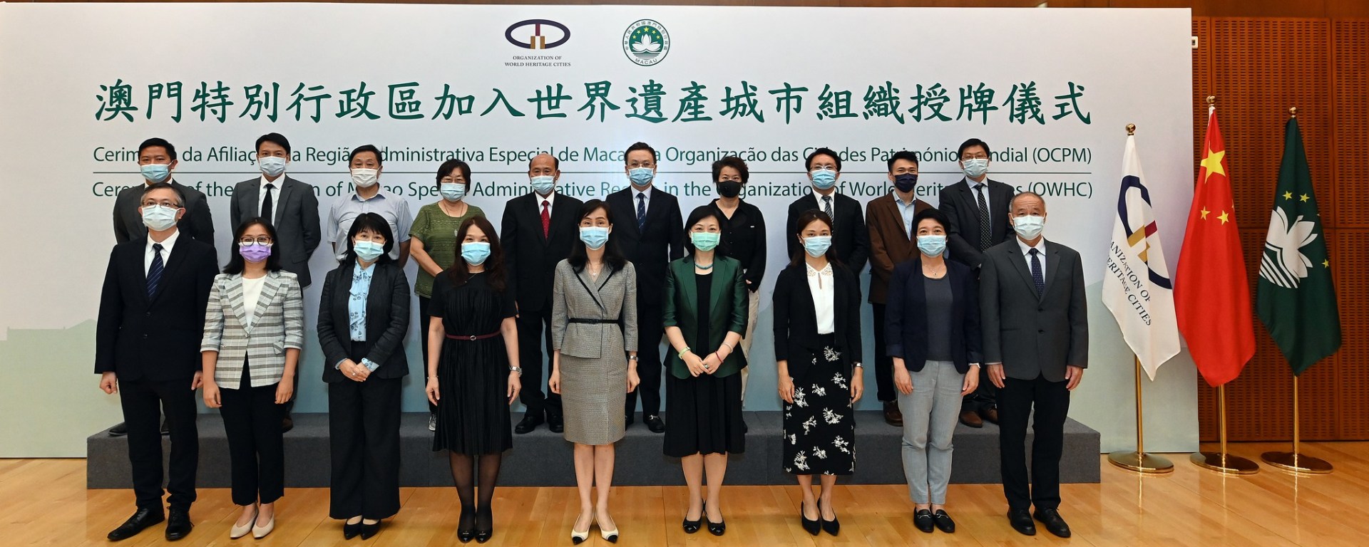 由澳門特別行政區政府、世界遺產城市組織聯合主辦的「澳門特別行政區加入世界遺產城市組織授牌儀式」於8月7日在本澳以視像會議形式舉行。會上,世界遺產城市組織向澳門特別行政區頒授世界遺產城市組織的證書,澳門特別行政區政府社會文化司司長歐陽瑜代表接受。澳門成為中國繼蘇州及都江堰後,世界遺產城市組織的第三個正式會員城市。是次加入世界遺產城市組織,將有利於澳門在國際上獲得世界遺產保護的資訊及參與活動,並借鑑先進的世界遺產保護經驗,提高澳門作為世界遺產城市的國際知名度。