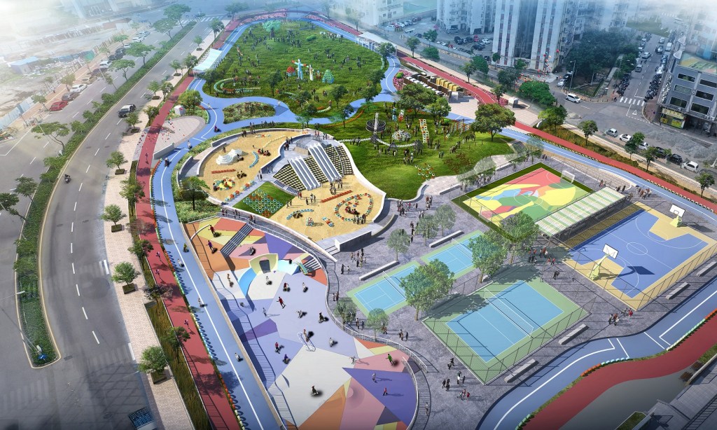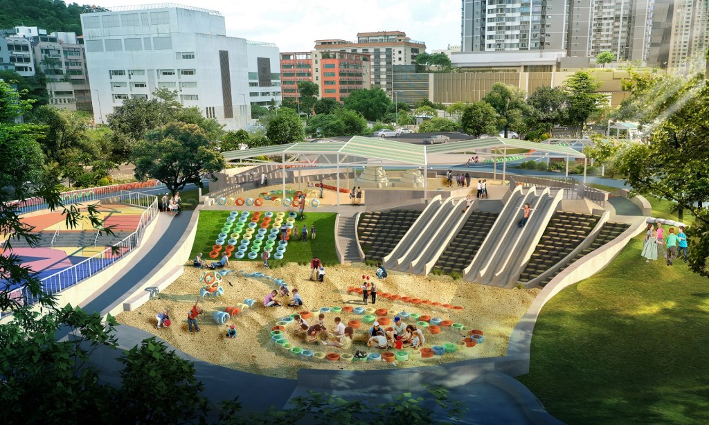 面向青少年的滑板天地,適合初學者及中階人士,利用原地型的高低落差而建,地面配以幾何色塊襯托充滿活力的形象。開心波地,設有足球場、籃球場、排球場及羽毛球場,周邊將設置健身設施、鵝卵石步道、遮陽廊及長椅等。