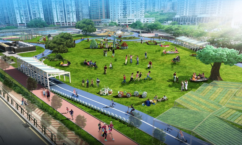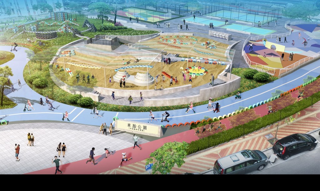 規劃中的車胎公園,以節約環保、返樸歸真為原則,因地制宜,利用高低起伏的原地型作整體佈局,以車胎為主設計元素,串連園內車胎樂園、親子草地、歡樂山丘、水沙世界、滑板天地、開心波地、環園跑步徑、環園小童滑板車道等各個功能區,為不同年齡層的居民提供動靜皆宜的親子互動、康樂遊樂空間。
