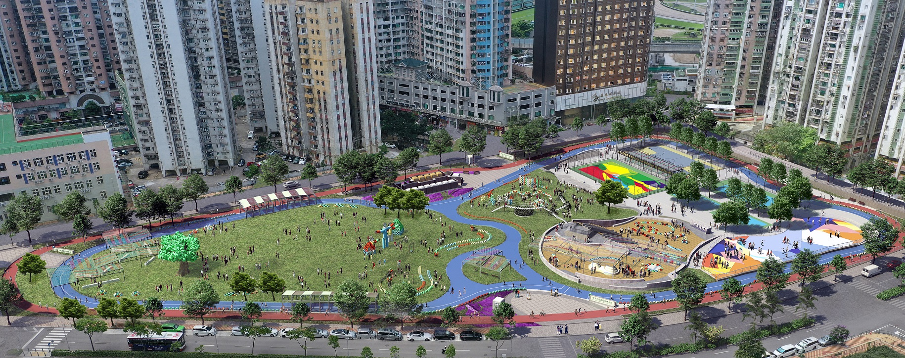 面向青少年的滑板天地,適合初學者及中階人士,利用原地型的高低落差而建,地面配以幾何色塊襯托充滿活力的形象。開心波地,設有足球場、籃球場、排球場及羽毛球場,周邊將設置健身設施、鵝卵石步道、遮陽廊及長椅等。