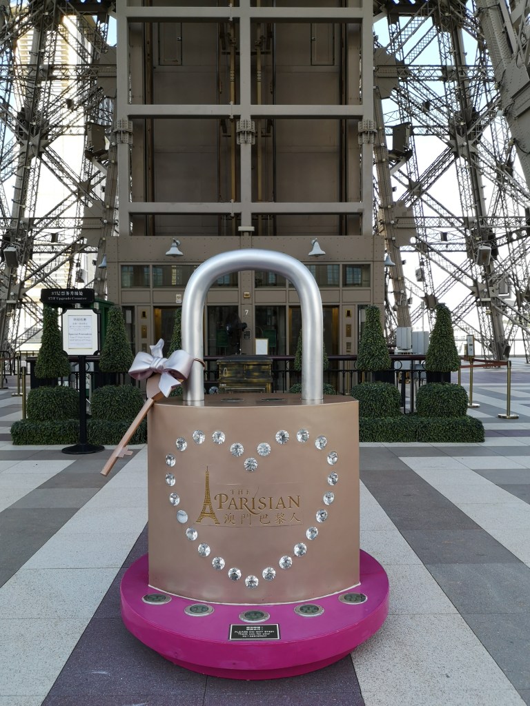 看畢藝術空間,可以轉到室外,參觀澳門巴黎人的巴黎鐵塔。這座巴黎鐵塔按真正的法國巴黎艾菲爾鐵塔二分一比例建成,讓澳門人在本地也感感受到濃濃的法國浪漫氣氛。遊人更可以登上鐵塔7樓的觀景台,飽覽路氹金光大道紙醉金迷的繁華景色。