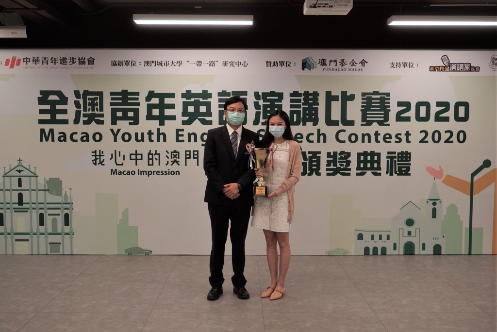由中華青年進步協會主辦「全澳青年英語演講比賽2020——我心中的澳門」日前成功舉辦,中央人民政府駐澳門特別行政區聯絡辦公室台灣事務部副部長級助理吳輝先生、教育暨青年局青年結社培訓暨輔導處甘少琴代處長、澳門城市大學「一帶一路」研究中心周平主任及中華青年進步協會張森華會長等出席並進行頒獎,比賽分別由譚心怡奪得冠軍;何浩禎奪得亞軍;梁嘉怡奪得季軍,而最佳人氣獎得主則為吳月。是次比賽由澳門城市大學「一帶一路」研究中心協辦,並獲得澳門我是演講家協會、澳門專業演講協會支持及澳門基金會贊助。
