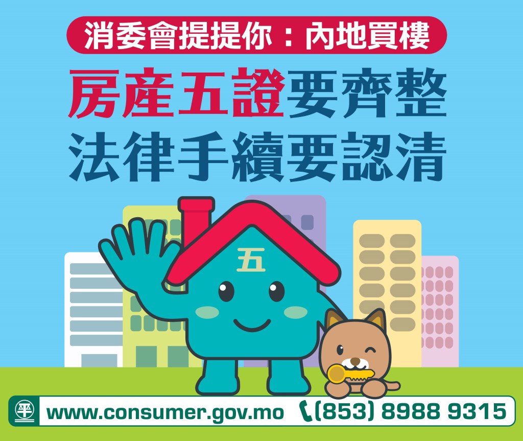 新出版的一期《澳門消費》介紹內地規管預售樓花,開發商必須具備及出示上述「五證」,消費者可登入消委會網頁( http://www.consumer.gov.mo )瀏覽相關資訊。如需查詢「廣告法」相關資訊,可瀏覽經濟局網頁(www.economia.gov.mo)或致電2871 2790。
