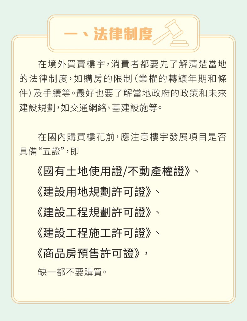如屬內地樓宇廣告,廣告內亦應以清晰可見的方式載有「五證」即「國有土地使用證/不動產權證」、「建設用地規劃許可證」、「建設工程規劃許可證」、「建設工程施工許可證」及 「商品房預售許可證」的編號以及「廣告法」第17條(關於樓宇廣告)的規定所要求的資訊。
