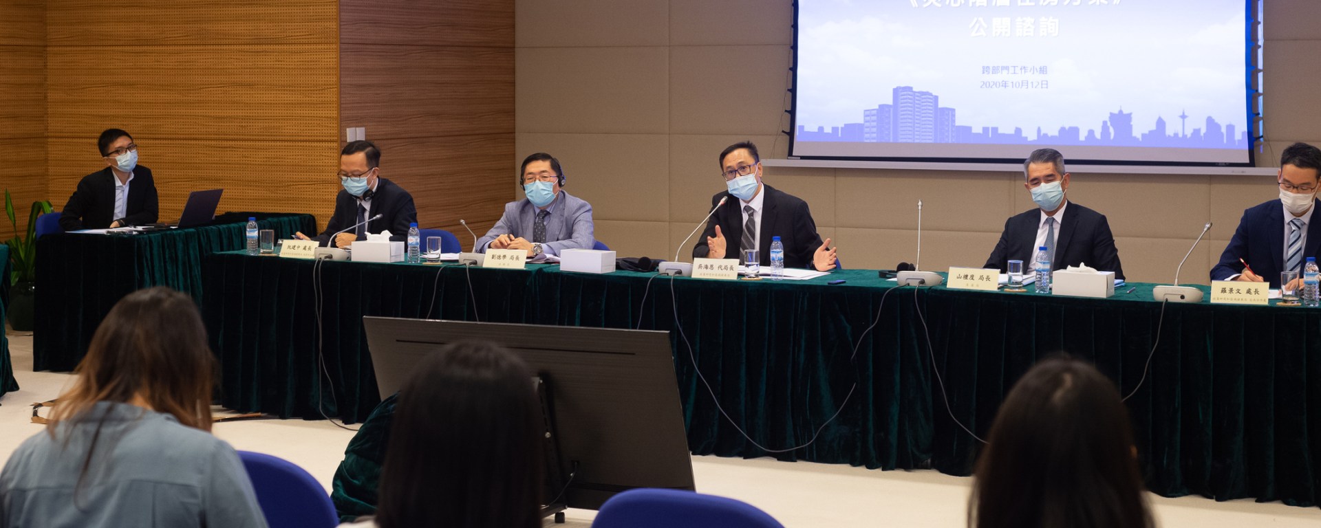 《夾心階層住房方案》跨部門工作小組於10月12日下午在政策研究和區域發展局會議室舉行《夾心階層住房方案》公開諮詢新聞發佈會。公開諮詢將於2020年10月13日至12月11日進行,為期60天,期間將舉行兩場面向公眾的諮詢專場和七場針對不同界別的諮詢專場。跨部門工作小組成員,包括政策研究和區域發展局吳海恩代局長、法務局劉德學局長、房屋局山禮度局長等出席了新聞發佈會。吳海恩介紹了《夾心階層住房方案》公開諮詢的背景、諮詢內容和諮詢方式。