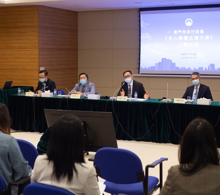 《夾心階層住房方案》跨部門工作小組於10月12日下午在政策研究和區域發展局會議室舉行《夾心階層住房方案》公開諮詢新聞發佈會。公開諮詢將於2020年10月13日至12月11日進行,為期60天,期間將舉行兩場面向公眾的諮詢專場和七場針對不同界別的諮詢專場。跨部門工作小組成員,包括政策研究和區域發展局吳海恩代局長、法務局劉德學局長、房屋局山禮度局長等出席了新聞發佈會。吳海恩介紹了《夾心階層住房方案》公開諮詢的背景、諮詢內容和諮詢方式。