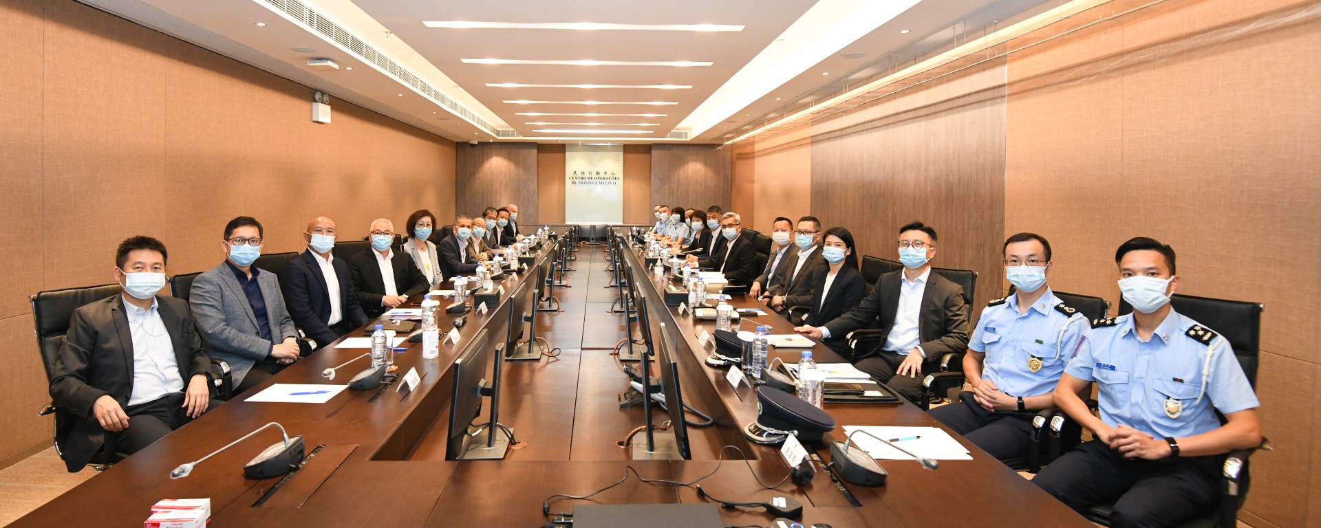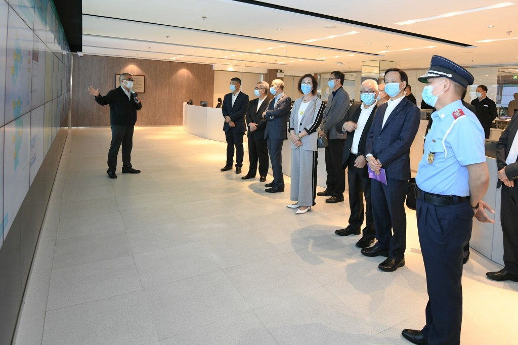 一行人亦抵達位於大樓三樓的警察總局民防行動中心,透過實地參觀各項配套設施設備,瞭解中心於《民防法律制度》正式生效實施後的運作機制,包括﹕事前24小時的基本運作模式﹔事中應急啟動、指揮調度、匯總信息的操作和事後恢復社會正常生活的職能。